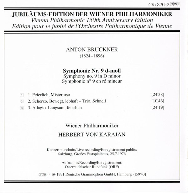 这是1976年7月25日卡拉扬在萨尔茨堡节日音乐厅与维也纳爱乐乐团现场表演布鲁克纳第九交响曲,由奥地利国家广播公司录音。