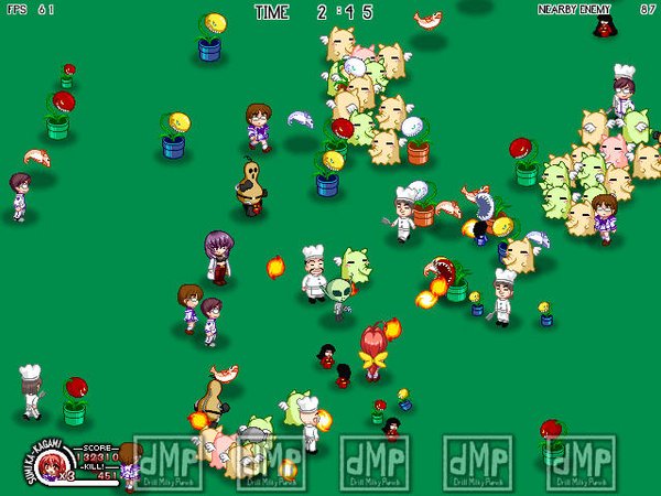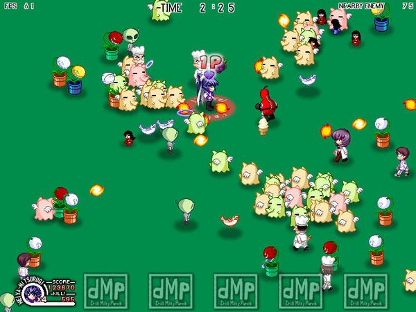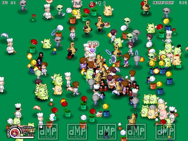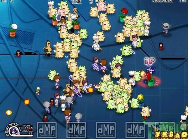 【游戏介绍】 千人大乱斗,无数敌人从四面八方涌来.你要尽可能的击退他它们.可以选择不同的人物.攻击方式也有不同.按住攻击键不放可以储劲提高攻击力.可以造成连击,据说屏幕内最多可以达到3000个敌人.这个游戏最多可以6人同玩.两个用键盘.4个用手柄.