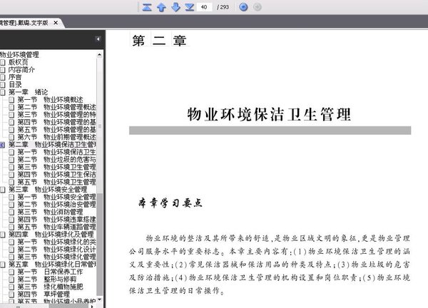 : 第一章 绪论 第一节 物业环境概述 一、环境概念 二、物业环境概念 第二节 物业环境管理概述 一、物业环境管理概念 二、物业环境管理目标 第三节 物业环境管理的特点 一、物业环境的城市生态环境背景 二、物业环境管理的特点 三、物业环境管理的发展趋势 第四节 物业环境管理的基本手段 一、法律手段 二、经济手段 三、行政干预手段 四、技术手段 五、宣传教育手段 第五节 物业环境管理的基本原则 一、环境具有价值的原则 二、全局和整体效益最优的原则 三、综合平衡的原则 四、持续发展的原则 五、政府干预和公众参与相结合的原则 第六节 物业前期管理概述 一、物业前期管理的必要性 二、物业前期管理的意义 三、物业前期管理需要完善的主要内容 四、物业前期管理应注意的问题 第二章 物业环境保洁卫生管理 第一节 物业环境保洁卫生管理概述 一、保洁管理的涵义 二、保洁工作的重要性 三、保洁管理的具体措施 四、专业承包公司的选择及监督检查 五、保洁器械和保洁用品 第二节 物业垃圾的危害与防治 一、物业垃圾的种类 二、物业垃圾成灾的原因 三、物业垃圾的危害 四、物业垃圾的防治 第三节 物业环境卫生管理机构的设置和职责划分 一、物业环境卫生管理机构的设置 二、物业环境卫生管理部各级人员的职责划分 第四节 物业环境卫生保洁的范围、要求和基本措施 一、物业环境卫生保洁的范围 二、物业环境卫生保洁工作的基本要求 ……