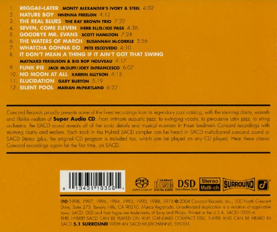: 01. Reggae-Later / Monty Alexander's Ivory & Steel 02. Nature Boy / Nnenna Freelon 03. The Real Blues / The Ray Brown Trio 04. Seven, Come Eleven / Herb Ellis & Joe Pass 05. Goodbye Mr. Evans / Scott Hamilton 06. The Waters Of March / Susannah McCorkle 07. Whatcha Gonna Do / Pete Escovedo 08. It Don't Mean A Thing If It Ain't Got That Swing / Maynard Ferguson & Big Bop Nouveau 09. Funk Pie / Jack McDuff & Joey DeFrancesco 10. No Moon At All / Karrin Allyson 11. Elucidation / Gary Burton 12. Silent Pool / Marian McPartland