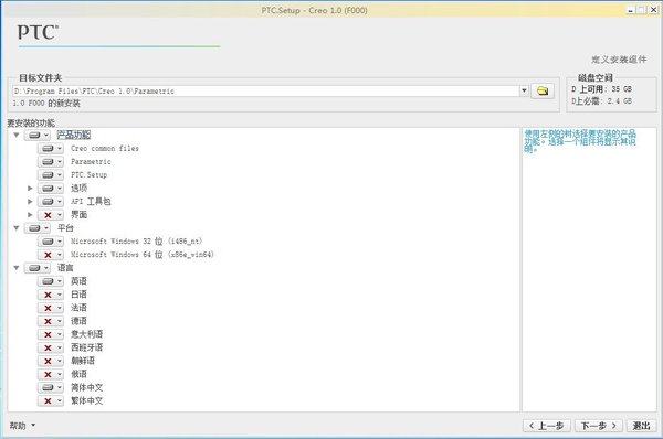 Creo 1.0 的32位和64位集成在同一个安装文件中,安装时会自动根据系统选择32位或64位版本进行安装