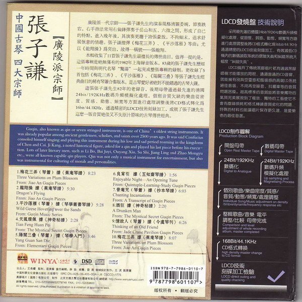 这张张子谦先生82年的老录音,后期母带通过最先进的德国24bit/192KHz数码升频模拟化处理,个别音质欠缺的乐曲从密度、质感、动态、频宽等方面进行处理调整后将CD格式转化为16bit/44 1KHz,通过精密的LDCD技术刻录加工,成就了张子谦先生这么一版音质绝佳又不失原汁原味的古琴传世经典。
