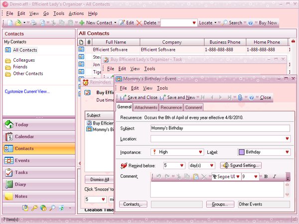 Turkish, Ukrainian 快乐女人好帮手,全球第一款专为女士设计的时间和联系人管理软件!时尚靓丽的软件界面,才能满足快乐女人的要求!一套程序即集成了通讯录、公历农历、日程安排、工作任务管理、日记本、备忘录、桌面便笺、密码管理器等诸多功能。软件有良好的便携性,绿色版本可以直接放到U盘运行;密码保护、自动备份等多种措施保证您数据的安全;类似Baidu的一键搜索,便于您快速查找自己的海量个人信息;集成类似Word的文字处理器,您可以随时书写日记、备忘和备注。另外,软件同时提供官方发布的免费体验版本,满足不同朋友们的需求。女人的一天,从打开“快乐女人好帮手”程序开始! 软件功能及特色集成化界面 快乐女人好帮手是集通讯录、日程安排、任务计划、公历农历、电子日记、便笺备忘、密码管理、网址收藏等诸多功能于一身的个人信息管理软件。软件具有集成化的界面,统一的操作方式。您无需分别打开几个不同的程序来管理您的个人事务。 中文特色 专为中国人设计,支持拼音首字母查询(支持姓氏多音字),农历,节气,生肖,干支,中国传统节日和主要节日的提醒等功能。 专为女人设计的多种界面风格 您可以选择爱,粉色佳人,温婉蓝,气质银,春意盎然,多情夏日和浪漫冬日等充分体现女人品味的界面风格。 强大的文档编辑器 内置强大的类似Word的文档编辑器,支持插入表格、图片、超链接、表情等内容,支持设置页面背景图形或者颜色。可用于书写日记、备忘,笔记等文档。 易于搜索 软件提供类似Baidu的简单的搜索方式。比如对于联系人,可以直接输入姓名、姓名拼音首字母、电话号码、或者地址的部分信息,然后按下回车键,软件即可智能化地搜索出相关信息。 良好的便携性 您可以下载绿色免安装版本,解压到您的优盘上运行。这样,您可以带着您的优盘,随时随地管理您的个人信息! 集成电子日记本 提供强大的编辑功能,使您的日记更加丰富多彩;支持一天书写多篇日记;可以给日记指定天气或心情图标。 集成密码管理 信息时代,我们需要记住的密码越来越多!密码管理器能帮助您安全地记录和查找您的各种密码,从此您只需记住一个密码! 集成桌面便笺 您可以将信息直接“贴”在桌面上!在电脑桌面就可以一目了然看到您的重要信息。 信息安全保障 软件提供回收站,您不用担心误删除重要信息;备份和恢复功能帮助您方便地保存和迁移数据;软件对密码等敏感信息均加密存储。您可以设置数据文件的打开密码,甚至还可以单独设置“密码管理器”、“日记本”、“备忘录”模块的登录密码。