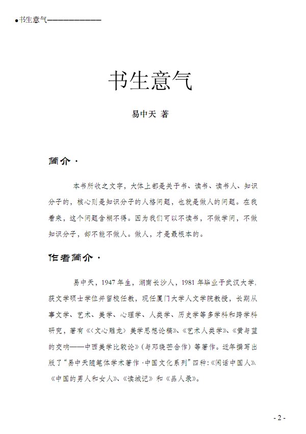 《书生意气》所收之文字,大体上都是关于书、读书、读书人、知识分子的,核心则是知识分子的人格问题,也就是做人的问题。 我们可以不读书,不做学问,不做知识分子,却不能不做人。做人才是最根本的。