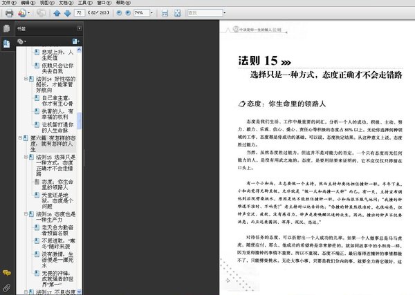 : 第一篇 左手做人,右手做事 第二篇 擦亮道德的牌匾,优化你的人生 第三篇 大胸怀塑造高境界 第四篇 心态各异,人生路不同 第五篇 性格的好坏决定命运的成败 第六篇 有怎样的态度,就有怎样的人生 ……………………………………………