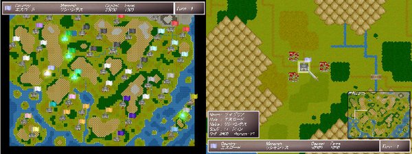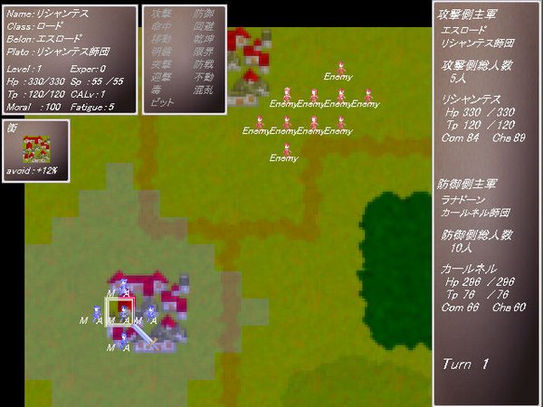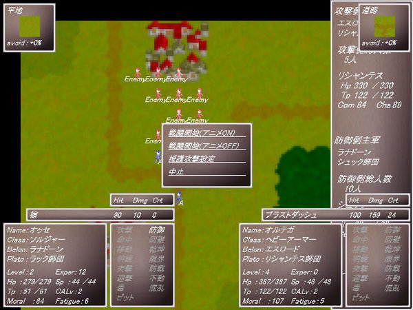 戦略モード概要 戦略モードでは自国の都市に指示、师団の操作などを行います。 敌対する全ての势力を灭ぼせばゲームクリアです。 缩小マップ上で白く光っている都市が自势力の都市です。 緑色に光っているのが同盟、従属、服従している势力の都市です。 名声が高い势力から顺番に行动が回ってきます。 戦略モード基本操作 ・右クリックで「全体コマンド」を呼び出します。 ・都市にカーソルを合わせると「都市の情报」が表示され、 クリックをすると「都市コマンド」を呼び出します。 ・都市の无い场所をクリックすると缩小マップと通常マップの切り替えが出来ます。 左が缩小マップで右が通常マップです。 ・通常マップで1キー押すとミニマップの表示、非表示を切り替えることが出来ます。 ・拡大マップで画面の端をクリックするかカーソルキーを押すと、 スクロールさせる事が出来ます。 シフトキーを押しながらカーソルキーを押すとスクロールが早くなります。 ・ゲームクリア后に自势力のキャラをお気に入りに登録できます。 登録キャラはどこの势力にいても死んでいても自动的に上书きされます。 戦术モード概要 ・师団同士の戦いで攻撃侧、防御侧のどちらかの本军が全灭するか、 10ターン経过すると终了します。 ・各师団に行动が回って来る顺番は师団长のComや师団员のAgiが影响します。 ・各师団には指挥范囲が存在し、指挥范囲内では命中、回避、クリティカル率がアップし、 条件を満たす事でチームスキルや援护攻撃を行えるようになります。 指挥范囲は攻撃侧が赤く、防御侧が青く表示されます。 戦略モード基本操作 ・右クリックで「全体コマンド」を呼び出します。 ・ユニットにカーソルを合わせると「キャラの情报」と地形の情报が 表示され、クリックをするとコマンドを呼び出します。 地形情报のavoidは回避率に+される数値です。 ・撃破されたキャラは死亡するか退却をします。 死亡したキャラはそのゲーム中には二度と登场しません。 退却したキャラは入院状态になり、しばらく行动不能になります。 ・戦闘终了后、胜利した势力は名声が上がり、败北した侧は名声が下がります。 戦闘确认 ・双方の使用スキルなどが表示されます。 Hitが命中率、Dmgが予想ダメージ、Crtがクリティカルヒットの确率です。 Dmgはあくまで予想で、実际のダメージより减ったり大きくなったりする场合があります。 ・防御した场合はダメージを减らす事が出来ます。 どれだけ减らすかは装备している盾によって変わります。 盾が无い场合は少ししかダメージを减らせません。 更多说明在压缩包里有