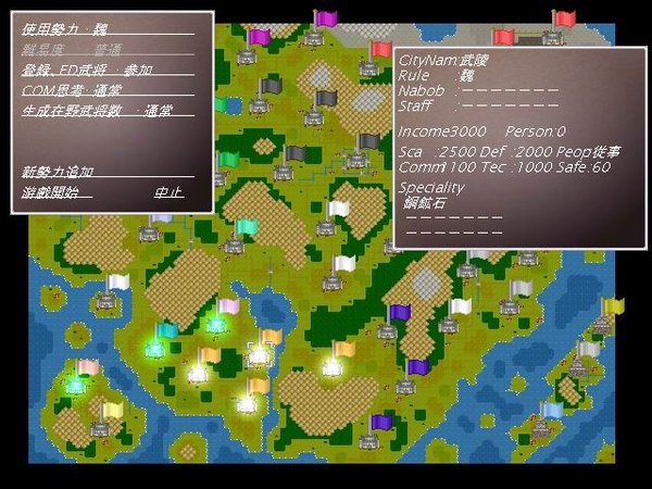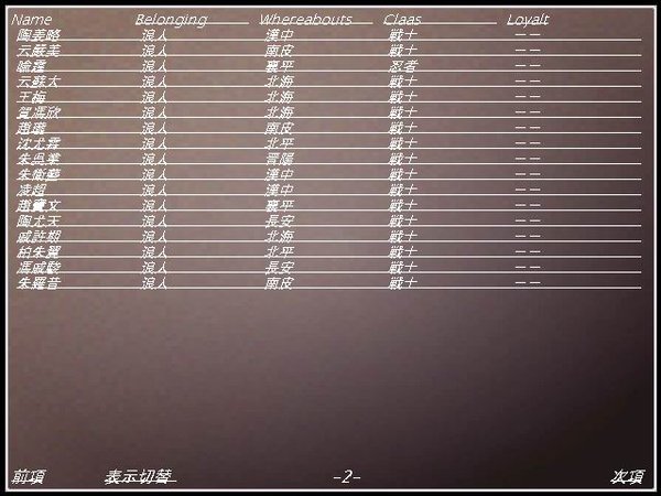 从06年第一版玩起,就对这个游戏爱不释手,后来对技能名字与说明看得头大,就动了心思想要汉化一下,因为当初目标仅是汉化部分内容,所以没去改变游戏内码,Shift_Jis字库中的汉字本来就不全,所以有些字就用了其他字来带代替,如吗字替换成了么,等等。所以严格来说,我仅汉化了两句话。。。。。一句是 是否结束游戏? 另一句是 参与游戏势力少于六方 。。。。囧 08年曾经发布的部分汉化版好像是建立在2.3版本基础上的,时间隔得太久了,现在的版本是在2.8D基础上汉化的,也就是官方最终版。 汉化了以下内容,主执行程序完全汉化;游戏设置完全汉化;技能名称完全汉化;技能说明完全汉化;所有剧本城市名称、势力名称全部汉化(城市名称采用三国志与信长系列部分地名代替,势力名称以中国历史各个朝代与部分信长系列势力名代替);所有随机生成的在野武将名汉化(固定武将名字未汉化,一是为了与登录武将更好区分,一看到日文名字就知道是不要花精力去培养的武将,二是如果按音译不一定准确,例如カーリー音译为凯莉,但从她手持的武器米斯特丁与职业女武神来看,她应该是瓦尔基里);职业名称完全汉化;小部分含参数语句汉化。等等。。。。 从技术角度来说,完全汉化已无任何问题,主要是缺翻译,剩下的基本上是一些对话之类的语句,完全靠机翻是不可能完成的,如果有朋友有兴趣或者能协助进行翻译,完全汉化并出简繁中文版是一件很简单的事情(最多一个礼拜)