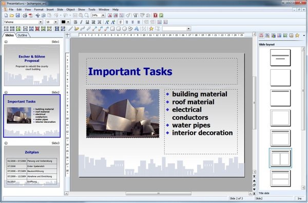 使用此强大的幻灯片演示程序,您可以自由放飞您的想象力!可嵌入多种格式的图形,使用自动表单,直接在程序中切割图片,嵌入影片或音频文件,还可以使用各种不同的效果,例如反射、阴影、透明、对象或文本块抗锯齿。制作的幻灯片可以根据需要保存/导出为各种格式,例如 PowerPoint 幻灯片、HTML 网站或 PDF 文档。如果需要,您还可以把它们打印出来分发给观众。