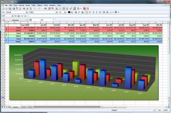 电子表格软件 Ashampoo PlanMaker 2010 相当于 Microsoft Excel,提供了 330 多 种计算功能,覆盖金融、统计、成本分析等等方面。表单对象、过滤功能、自动求和、分组大表格、语法高亮和新的“侦测器”(公式检查器)将有效得简化复杂图表的处理。