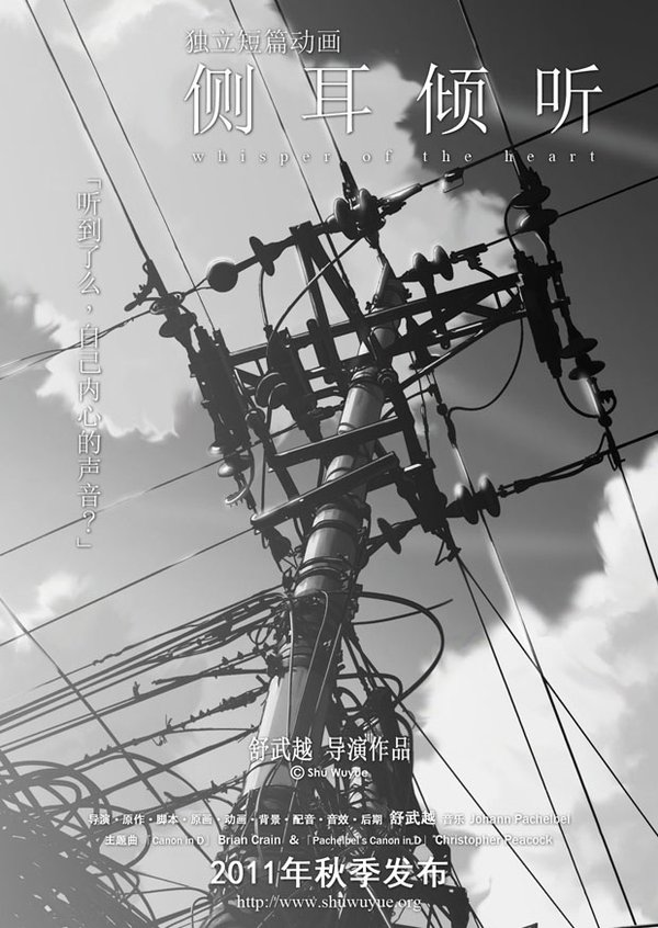 看完预告片的朋友都会不约而同地提到日本新生代动画导演新海诚。在做动画之前的多年里,我的创作内容都是文字类的,包括散文和随笔,看过我的文字作品的朋友应该知道(没看过的朋友可以到宣传主页http://www.shuwuyue.org里阅读我的部分文字作品^---^),「侧耳倾听」的画面风格与我的行文风格是相契合的,并非刻意地为了模仿而模仿。但不可否认,整部作品里有很多新海诚元素,比如对云的处理,光影的添加等等。而这样做的目的也只是希望画面美一些、好看一些。不论大家对「侧耳倾听」的画面是否喜欢,作为作者的我,更多的则是希望大家去感受我在作品中想要传达的东西,我想这才是最为重要的。