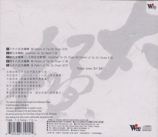 获中国时报84年度民族音乐销售排行榜第五名 结合音乐与太极养生运动,一张最适合习拳者使用的练拳音乐;亦是养生调息的良好辅助音乐。风靡欧、美、日、深受欢迎、人气最旺的健身音乐。