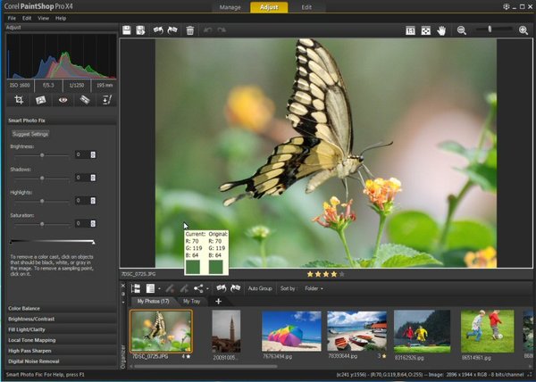 Welcome to a more enjoyable photo-editing experience! The PaintShop Pro X4 interface has been redesigned with separate Manage, Adjust and Edit workspaces so it's easy to find the tools you need when you need them. Plus, the Organizer is now available from every workspace.
