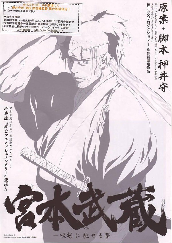押井守大神在08年推出大作《Sky Crawler》之后,又将和Production IG合作拍摄一部新电影《宫本武藏:双剑驰骋之梦》(「宫本武蔵ー双剣に驰せる梦」)。   押井守本次将担任原案和剧本,而导演则是在《攻壳机动队》《攻壳机动队之无罪》和《Sky Crawler》中都有参与导演的西久保瑞穂。   这部电影改编自讲述日本江户时代的大剑豪宫本武藏的《五轮书》的压轴章节“双剑驰骋之梦”,除了表现日本古代的骑士道和马上剑法之外,还将对《五轮书》的精义用全新的解释加以表现。