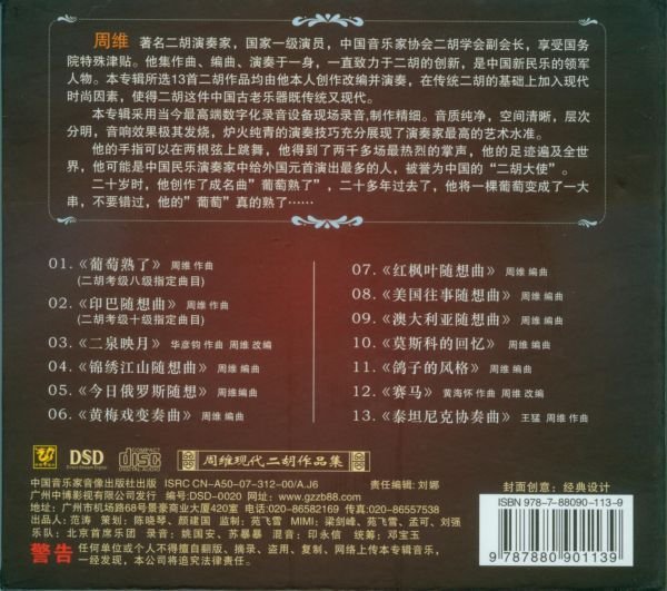 周维,著名二胡演奏家,国家一级演员,中国音乐家协会二胡学会副会长,享受国务院特殊津贴.他集作曲,编曲,演奏于一身,一直致力于二胡的创新,是中国新民乐的领军人物.本专辑所选13首二胡作品均由他本人创作改编并演奏,在传统二胡的基础上加入现代时尚因素,使得二胡这件中国古老乐器既传统又现代。