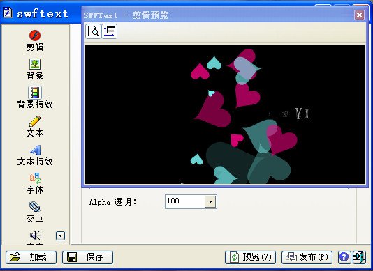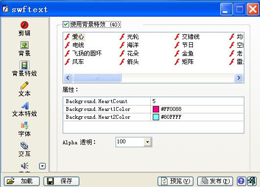 一款非常棒的Flash文本特效动画制作软件,可以制作超过200种不同的文字效果和20多种背景效果,可以完全自定义文字属性,包括字体、大小、颜色等等,使用SWFText完全不需要任何的Flash制作知识就可以轻松的做出专业的Flash广告条和个性签名!
