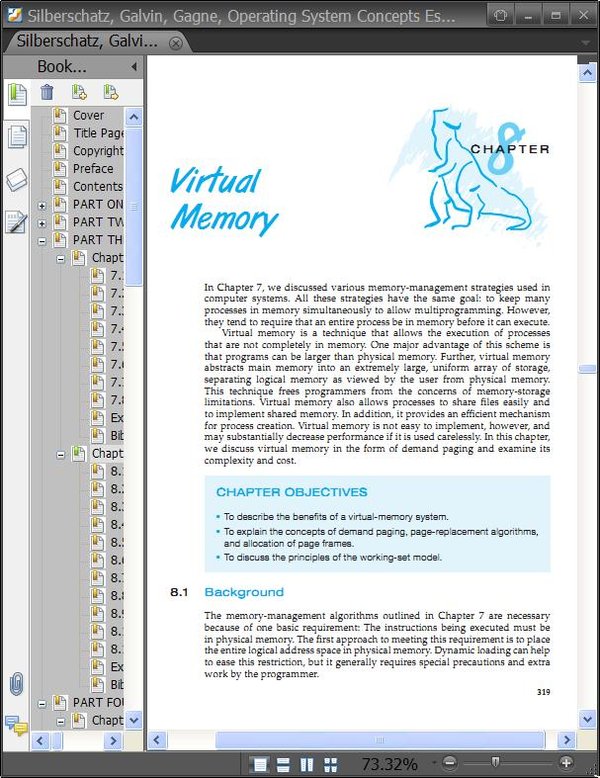 : part one overview chapter 1 introduction chapter 2 operating-system structures part two process management chapter 3 processes chapter 4 threads chapter 5 cpu scheduling chapter 6 process synchronization chapter 7 deadlocks part three memory management chapter 8 main memory chapter 9 virtual memory part four storage management chapter 10 file-system interface chapter 11 file-system implementation chapter 12 mass-storage structure chapter 13 i/o systems part five protection and security chapter 14 protection chapter 15 security