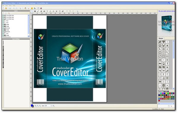 With the TBS Cover Editor no additional expensive third party tools are required. The program supports all the steps of box shot and cover creation: from drafting and design, to 3D scene setting and image rendering. The TBS Cover Editor has a rich toolkit for graphics creation and processing, including simple shapes, text labels, bitmap images, artistic texts and vector objects. You can quickly create a nice looking box cover by combining special effects that were previously only available in high-priced professional image processing programs. The TBS Cover Editor comes with a large clipart library of common shapes and signs. You can create professional-quality 3D box shots, CD, DVD or book covers with no extra expense in a single program.