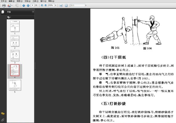 : (一) 紧握两拳 (二) 抓握打锤 (三) 单拳撑卧 (四) 打千层纸 (五) 打铁砂袋