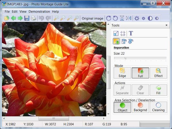 Changes the image size and aspect ratio, removes objects without visible traces. Separates solid objects from an arbitrary background and transfers them to another photo, allows combining two pictures together.