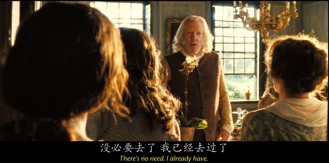 一个长镜头带着观众了解伊丽莎白家。她家有照料起居的仆人,她的爸爸班尼特先生是个拥有一定家产的庄园主,虽然生活无忧,但社会地位距离男主人公达西这样的显赫贵族还相距甚远。