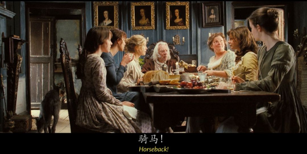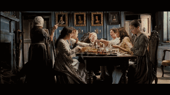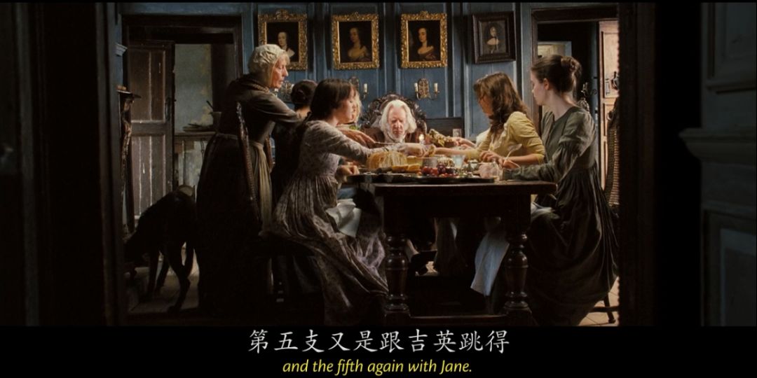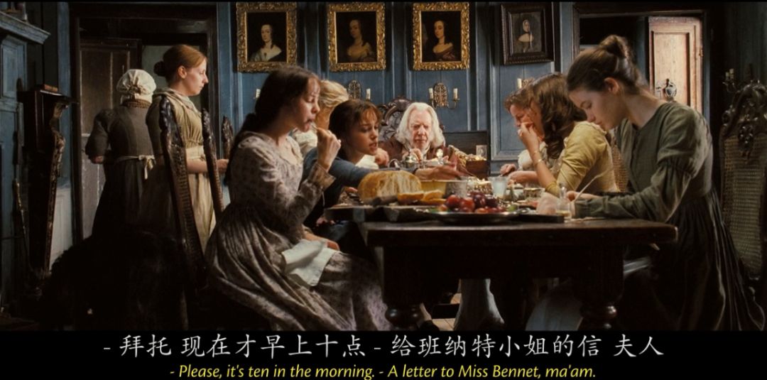 我们可以看到一家人非常默契融洽,班纳特不用开口,一伸手,就有女儿递给他想要的食物。