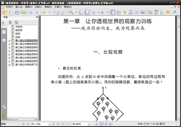 : 第一章 让你透视世界的观察力训练 一、比较观察 最近的距离 二、顺序观察 迭放的波斯地毯 金字塔的碎片 破碎的心 取代问号的图形 哪个不相称 完全吻合 选择图案 驱车寻宝 丁丁梦游数字城 巧锯木块 重新排列 ……