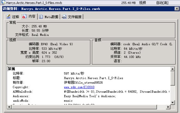 【编码参数】: 代码 概要 完整名称 : Harrys.Arctic.Heroes.Part.I_S-Files.rmvb 文件格式 : RealMedia 文件大小 : 255 MiB 长度 : 58分 54秒 平均混合码率 : 597 Kbps 电影 : Harrys.Arctic.Heroes.Part.I_S-Files 艺术家 : 伊甸园Sfile_steven89526 版权 : www.ydy.com(C)2010 视频 ID : 1 文件格式 : RealVideo 4 编码设置ID : RV40 编码设置ID/信息 : Based on AVC (H.264), Real Player 9 长度 : 58分 54秒 码率 : 533 Kbps 画面宽度 : 624像素 画面高度 : 352像素 画面比例 : 16:9 帧率 : 23.000 fps bits/(pixel*frame)(数据密度) : 0.106 大小 : 225 MiB (88%) 音频 ID : 0 文件格式 : Cooker 编码设置ID : cook 编码设置ID/信息 : Based on G.722.1, Real Player 6 长度 : 58分 55秒 码率 : 64.1 Kbps 声道 : 2声道 采样率 : 44.1 KHz 分辨率 : 16位 大小 : 27.0 MiB (11%)