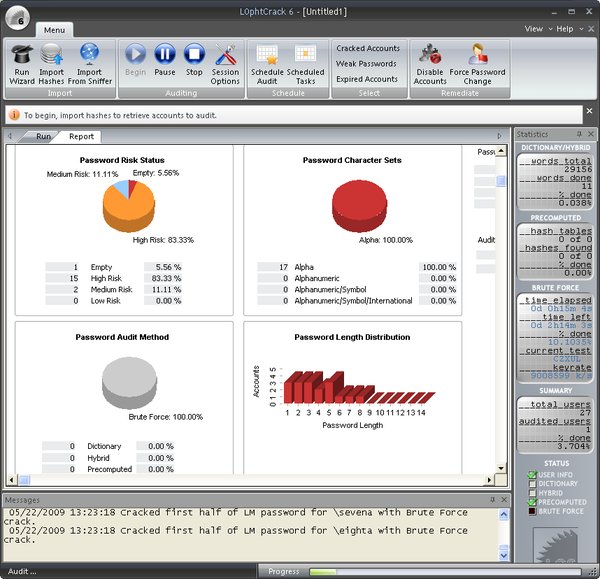 L0phtCrack 6 has real-time reporting that is displayed in a separate, tabbed interface. Auditing results are displayed based on auditing method, risk severity, and password character sets.