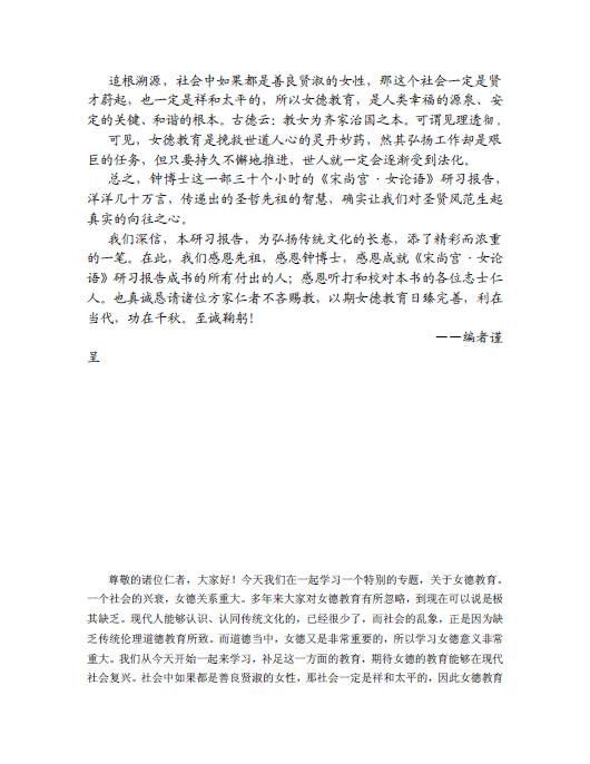 《宋尚宫•女论语》选录于《五种遗规》的《教女遗规》,历来被崇尚女德教育的大德们所推崇。本研习报告首先用六个小时,对于学习女德的意义,做了一个专题讨论,这也是报告总前言;之后,博士高屋建瓴而又深入浅出,利用二十几个小时,带领大家逐字逐句对《女论语》进行了详细的研习;最后劝勉大家推广、力行女德,并特别强调女德教育以童蒙养正时期为最佳。
