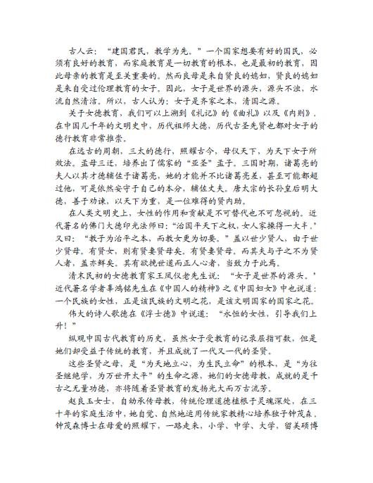 追根溯源,社会中如果都是善良贤淑的女性,那这个社会一定是贤才蔚起,也一定是祥和太平的,所以女德教育,是人类幸福的源泉、安定的关键、和谐的根本。古德云:教女为齐家治国之本。可谓见理透彻。