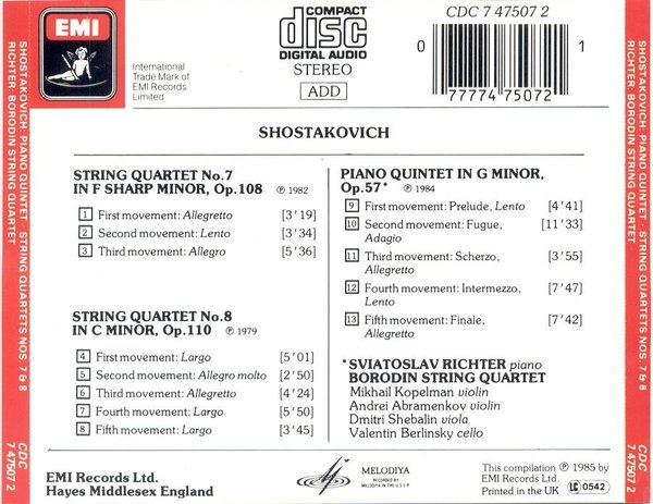 Borodin Quartet Richter -肖斯塔科维奇弦乐四重奏7、8及钢琴五重奏 Shostakovich:String Quartet7、8