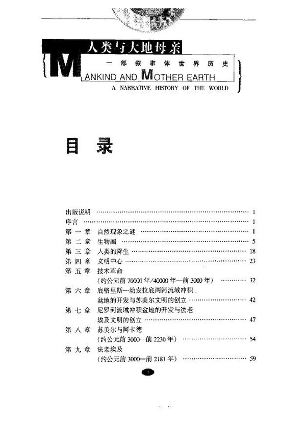 : 出版说明 序言 第01章 自然现象之谜 第02章 生物圈 第03章 人类的降生 第04章 文明中心 第05章 技术革命(约公元前7万年/4万年-前3000年) 第06章 底格里斯-幼发拉底两河流域冲积盆地的开发与苏美尔文明的创立 第07章 尼罗河流域冲积盆地的开发与法老埃及文明的创立 第08章 苏美尔和阿卡德(约公元前3000-前2230年) 第09章 法老埃及(约公元前3000-前2181年) 第10章 世界的地平线(约公元前2500-前2000年) 第11章 旧大陆文明中心(约公元前2140-前1730年) 第12章 马的驯化与欧亚草原游牧生活的创造 第13章 区域文明之间的相互关系(约公元前1730-前1250年) 第14章 旧大陆的民族大迁徙(约公元前1250-前950年) 第15章 中美洲“奥尔梅克”文明的出现 第16章 苏美尔-阿卡德世界与埃及(约公元前950-前745年) 第17章 叙利亚文明(约公元前1191-前745年) 第18章 希腊文明(约公元前1050-前750年) 第19章 印度文明(约公元前1000-前600年) 第20章 中国文明(公元前1027-前506年) 第21章 中美洲文明和安第斯文明(约公元前800-前40o年) 第22章 亚述军国主义的最后一搏与同时期欧亚大平原上的异军突起 第23章 亚述军国主义的灾难性后果(公元前605-前522年) 第24章 希腊文明(约公元前750-前507年) 第25章 开启精神生活的新里程(约公元前600-前480年) 第26章 第一波斯帝国(约公元前550-前330年) 第27章 第一波斯帝国与希腊世界的对抗(公元前499-前330年) 第28章 希腊文明的文化成就(公元前478-前338年) 第29章 亚历山大征服第一波斯帝国的政治后果(公元前329-前221年) 第30章 希腊文明的发展与传播(公元前334-前221年) 第31章 中国的战国时代(公元前506-前221年) 第32章 中国的百家争鸣公元前506-前221年) 第33章 印度文明(约公元前600-前200年) 第34章 争夺地中海西部地区霸权的斗争(约公元前600-前221年) 第35章 中国的秦帝国和西汉帝国(公元前221-公元9年) 第36章 地中海地区、西南亚和印度(公元前221-公元48年) 第37章 中华、贵霜、安息和罗马诸帝国(公元前31-公元220年) 第38章 旧大陆文明中心诸宗教与哲学的相互影响 第39章 中美洲文明和安第斯文明(约公元前400-公元300年) 第40章 旧大陆文明中心的西端(220-395年) 第41章 印度文明(约224-490年) 第42章 公元4-5世纪来自欧亚大平原的匈奴冲击波 第43章 罗马帝国与波斯帝国(395-628年) 第44章 西方基督教世界(395-634年) 第45章 基督教会的建立与分裂(312-657年) 第46章 印度文明(490-647年) 第47章 中国的政治分裂和她对佛教的容纳(220-589年) 第48章 中美洲文明和安第斯文明(约300-900年) 第49章 先知和政治家穆罕默德(约570-632年) 第50章 伊斯兰教国家的扩张(633-750年) 第51章 东罗马帝国的复兴(628-726年) 第52章 西方基督教世界(634-756年) 第53章 东亚(589-763年) 第54章 伊斯兰教世界(750-945年) 第55章 拜占庭文明(726-927/928年) 第56章 西方基督教世界(756-911年) 第57章 斯堪的纳维亚人的崛起(793-1000年) 第58章 印度和东南亚(647-1202年) 第59章 东亚(763-1126年) 第60章 中美洲文明和安第斯文明(约900-1428年) 第61章 伊斯兰教世界(945-1110年) 第62章 拜占庭世界(927/928-1071年) 第63章 西方基督教世界(911-1099年) 第64章 伊斯兰教世界(1110——1291年) 第65章 拜占庭世界(1071-1240年) 第66章 西方基督教世界(1099-1321年) 第67章 东亚(1126-1281年) 第68章 蒙古人和他们的后继者 第69章 伊斯兰教世界(1291年-1555年) 第70章 东正教世界(1240-1556年) 第71章 西方基督教世界(1321-1563年) 第72章 东南亚(1190-1511年) 第73章 东亚(1281-1644年) 第74章 中美洲文明和安第斯文明(1428-1519年) 第75章 人类文明世界的联接(1405-1652年) 第76章 西方文明(1563-1763年) 第77章 东正教世界(1556-1768年) 第78章 伊斯兰教世界(1555-1768年) 第79章 东亚(1644-1839年) 第80章 生物圈(1763-1871年) 第81章 生物圈(1871-1973年) 第82章 抚今追昔,以史为鉴(1973年)