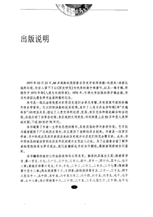 阿诺尔德·J·汤因比(Arnold Joseph Toynbee),1889年4月14日生于伦敦,卒于1975年10月22日。英国历史学家。牛津大学毕业,曾任该校研究员(1912-1915)。第一次世界大战时期曾在英国外交部情报部作(1915);战后作为英国代表团的成员出席过巴黎和会(1919)。二十世纪二十年代先后担任过伦敦大学教授(1924)、皇家国际问题研究所部长(1925)、伦敦大学国际关系史教授。二次大战时期曾任英国外交部调查部长(1943-1946)。   1921年他计划巨著《历史研究》,1927-1928年着手写作。 1934-1961年出版了12卷,评述世界历史。注重无文字记载的文明和欧洲以外地区文明。提出一种以分析各种文明的循环和衰落为基础的历史哲学。因其他事务(1939-1943年任皇家国际事务学会外事部研究室主任、1943-1946年任外交部研究司司长等)而中断巨著的继续写作。   一生著作颇多,主要有《历史研究》12卷,先后于1934-1961年出版,以综合观点对人类历史进行了新的展望。另外还有《民族与战争》(1915)、《希腊的历史思想》(1924)、《1924-1938年国际事务概述》、《经受考验的文明》(1948)以及《一个历史学家的宗教观》等。 汤因比先生的其他电子书: 《汤恩比博士看二十一世纪的世界》 台湾华藏卫视版[WMV] 《展望21世纪-汤因比与池田大作对话录》([英]汤因比 & [日]池田大作)扫描版[PDF] 《中国文明与世界:汤因比的中国观》扫描版[PDF] 《历史研究:插图本 -(英)汤因比》(A study of history)世纪人文丛书[PDF] 《人类与大地母亲》(Mankind and Mother Earth)扫描版[PDF]