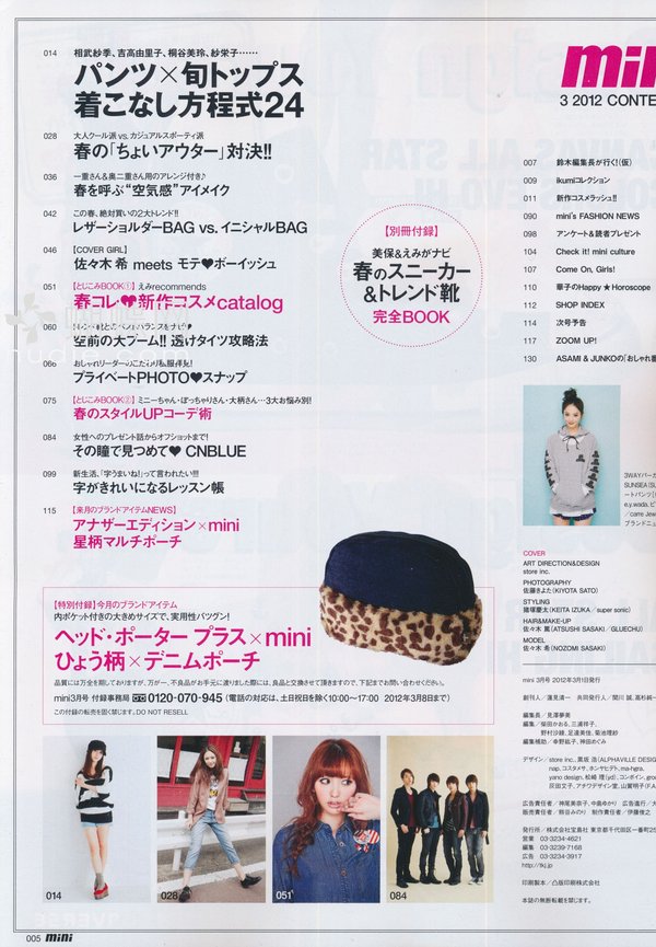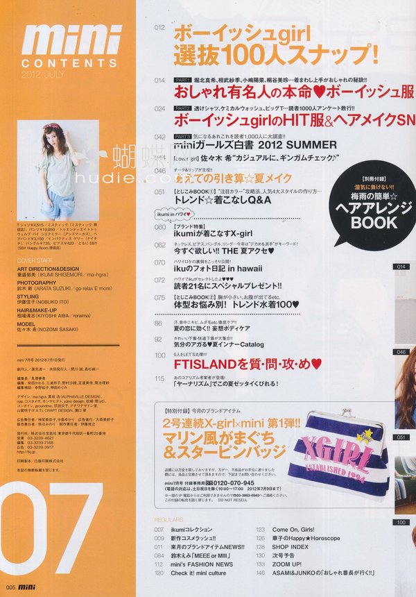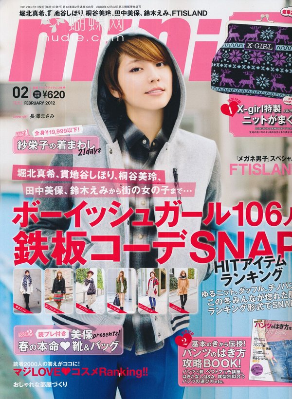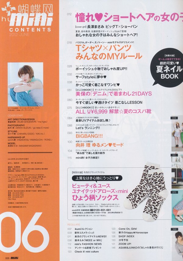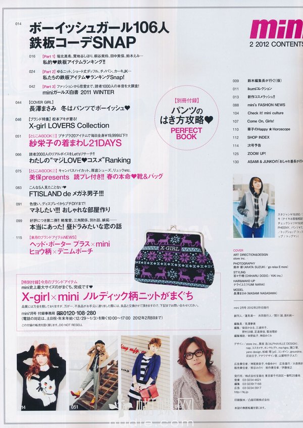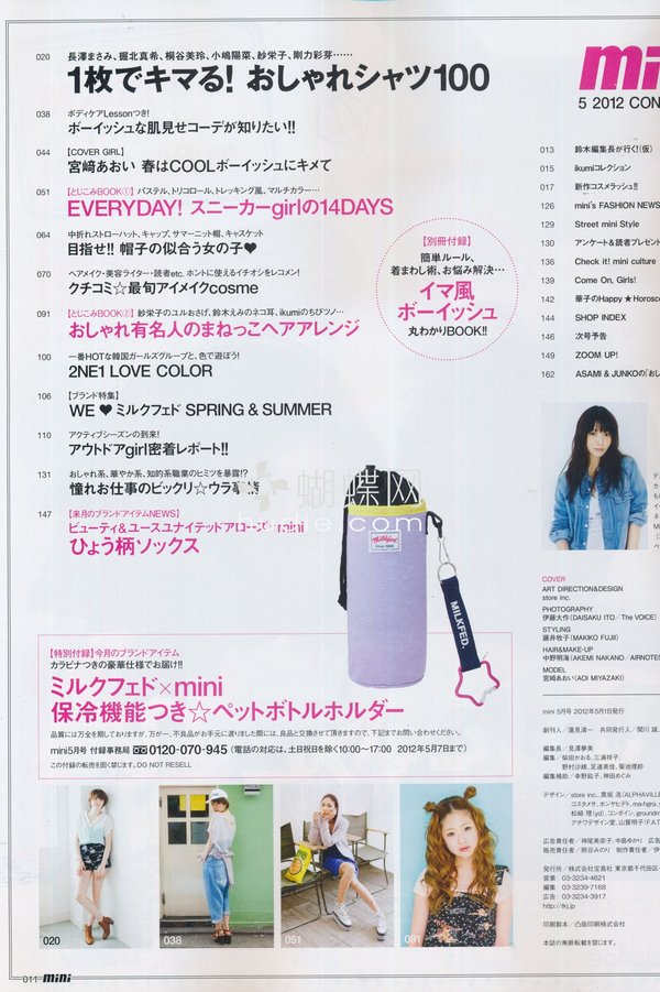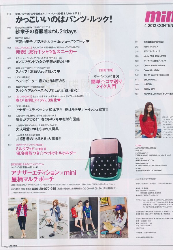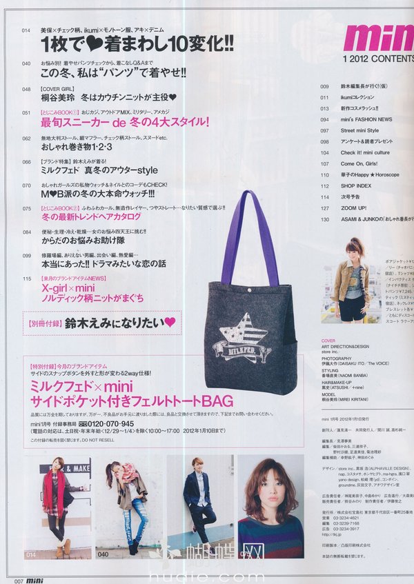 《mini》日本少女个性休闲装时尚杂志,性感、辛辣通通都走开!青春的mini,阳光十足!mini女孩钟情率性装扮! 白色绒绒外套+轻盈褶褶裙——再来双出彩的帆布靴......简单有个性! mini的少女模特特别有味道,mini的摄影师也堪称日本顶级。