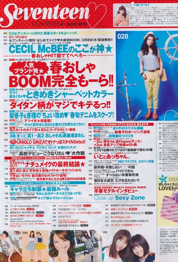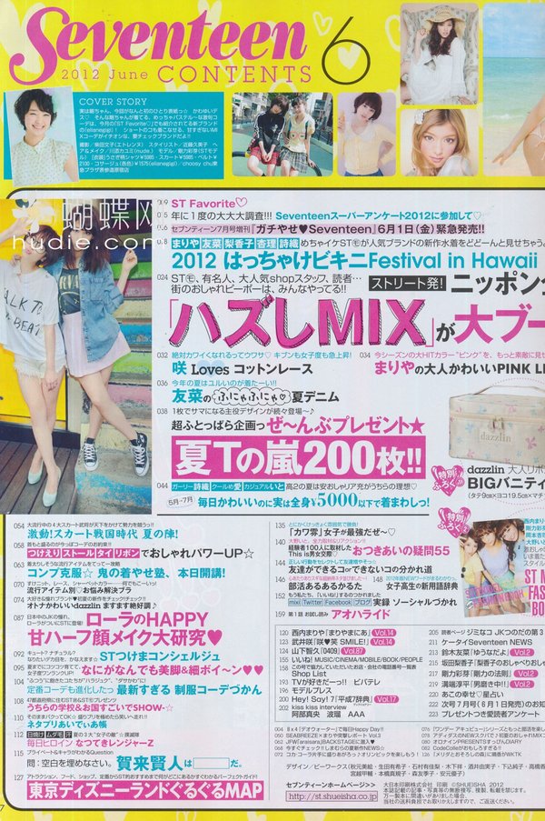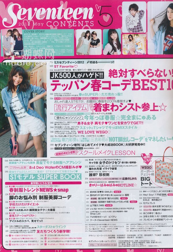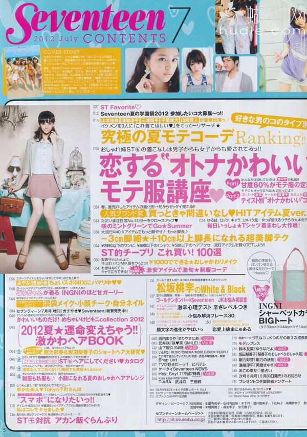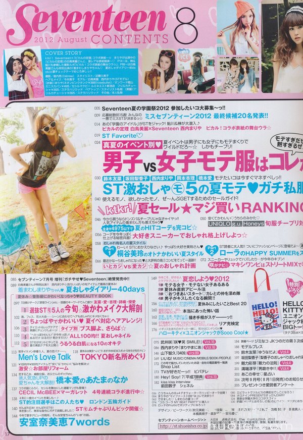 SEVENTEEN针对13到19岁少女,引领俏丽少女流行趋势的情报杂志。铃木EMI、北川景子、浅见莉奈、田中美保、土屋安娜、木村KAELA等人皆曾为ST专属模特儿,成为日本国高中女生流行教主及装扮的仿效对象。要掌握最新高中女生流行,那就千万别错过日本销售第一名的teenager少女杂志SEVENTEEN!