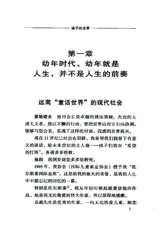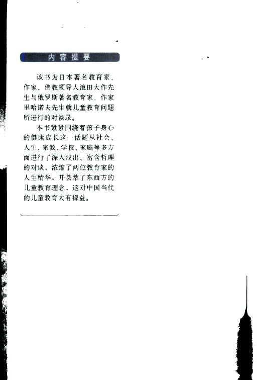 该书为日本著名教育家、作家、佛教领导人池田大作先生与俄罗斯著名教育家、作家里哈诺夫先生就儿童教育问题所进行的对谈录。