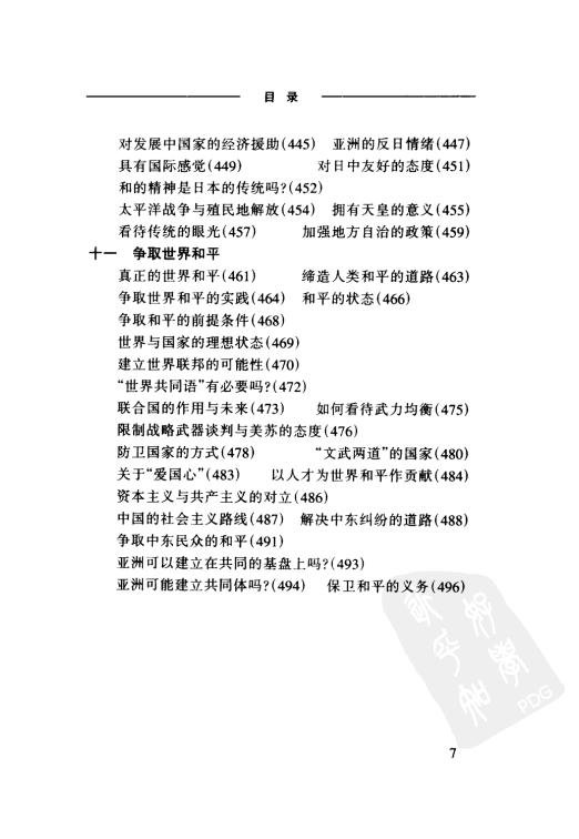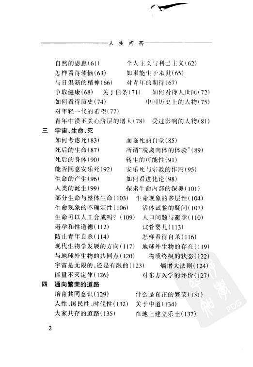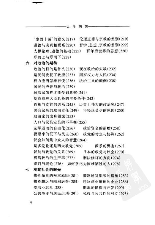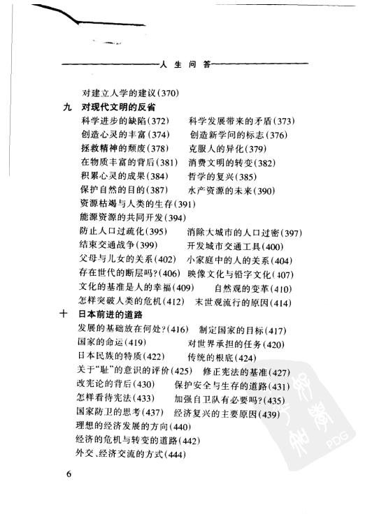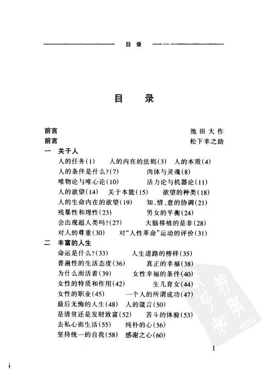 : 前言 前言 一 关于人 二 丰富的人生 三 宇宙、生命、死 四 通向繁荣的道路 五 宗教、思想、道德 六 对政治的期待 七 观察社会的眼光 八 教育是为了什么? 九 对现代文明的反省 十 日本前进的道路 十一 争取世界和平