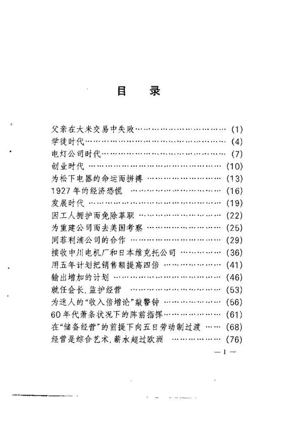 : 父亲在大米交易中失败 学徒时代 电灯公司时代 创业时代 为松下电器的命运而拼搏 1927年的经济恐慌 发展时代 因工人拥护而免除革职 为重建公司而去美国考察 同菲利浦公司的合作 接收中川电机厂和日本维克托公司 用五年计划把销售额提高四倍 输出增加的计划 就任会长,监护经营 为迷人的“收入倍增论”敲警钟 60年代萧条状况下的阵前指挥 在“储备经营”的前提下向五日劳动制过渡 经营是综合艺术,薪水超过欧洲 创业50周年纪念大会 振兴人口过稀地区,建造万博松下馆 退任会长,决意更新 履历表