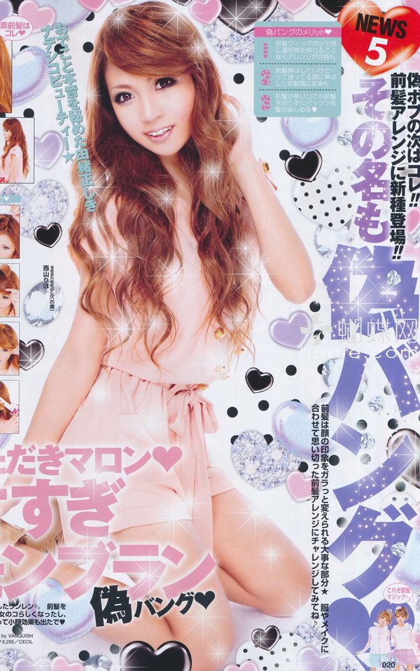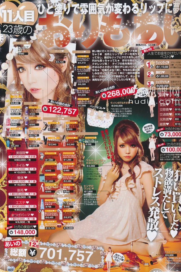 封面杂志发型的重点是把金发的后头顶部高耸起来,两边卷起。化妆时,上眼睑和下眼睑都画上粗粗的眼线。深色类的眼黛涂满整个眼窝,睫毛也反复涂色,涂得又长又粗,总之,重点在于让眼睛看上去大大的。使得眼睛看上去变颜色的彩色隐形眼镜也被广泛地爱用。还有,强调丰满胸部的露肩印花连衣裙、露出腿脚的超短裙,总之以看上去性感露出肌肤的款式为基本。为此,努力减肥或美容,美丽的身体不可缺少。还十分讲究美甲。另外,名牌装饰品及手袋、妆点着玫瑰或蝴蝶结的高跟鞋等,此外还有手持装饰美丽的手机,也就是手机壳上铺满了人工宝石及心状、玫瑰等装饰,从头到脚全身涌满了过剩的奢侈装饰。