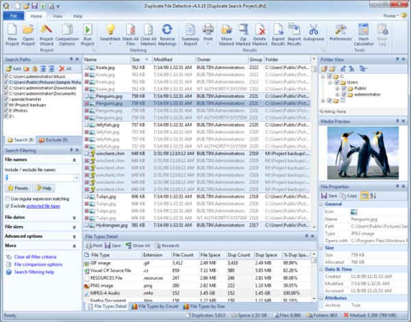 Duplicate File Detective uses state-of-the-art file content analysis technology to show you exactly where your duplicate files are. You can search multiple file systems - folders, drives, removable storage devices, even network shares - all in a single pass. Then use the powerful Duplicate Result Manager to move, zip, or delete duplicate files safely, all with assistance from our innovative SmartMark duplicate file selection system.