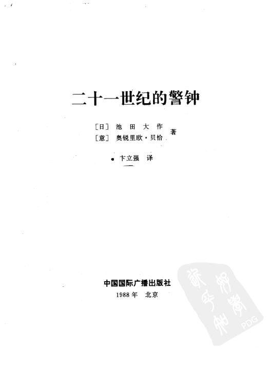 这书《二十一世纪的警钟》为著名学者池田大作和奥锐里欧·贝恰的对谈集。是一部有关人类现状与未来展望的著述。它是从人的过去的思考、行动与行为,从人所无法控制的各种事件来展开的,并论述了这一切都是可以由现在的形势及今后的人类活动来左右的。