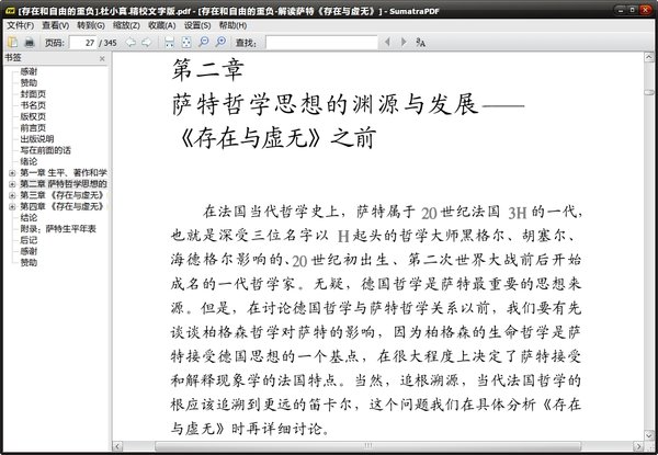 西本身”。萨特要确立一种建立在主体现象存在的现象学上的“认识存在论”,对哲学现代性的原则的各种概念进行改造和更新。应该看到,萨特在《存在与虚无》中,已经先于福柯、德勒兹、拉康等发表了许多精妙的创见,它是“现代哲学的最后一次尝试,一要从黑格尔主义中走出来的最后努力”。这意欲从一切既定的理论“专制”中脱离的追求,带有那个时代的鲜明印记:超越的行动,摆脱的力量。所以,如果不从时代和理论两方面的背景出发开始解读,就很难明白《存在与虚无》所表述的现象学存在论。《存在与虚无》告诉人们:人不是一个实体,是意识,所以他命定要向外,命定要自由选择自己的行动,不管命运多么令人不可忍受,我们都有权利砸碎它。只有人的自由选择的行动才能赋予存在以意义,而人绝对是自己行为的“作者”,必须要对之负完全的责任。自由是一种“重负”,人必须勇敢地承担它。正是为了说明这个中心思想,萨特写下了这部60多万字的《存在与虚无》,这也是这本书给我们的最重要的启示之所在。