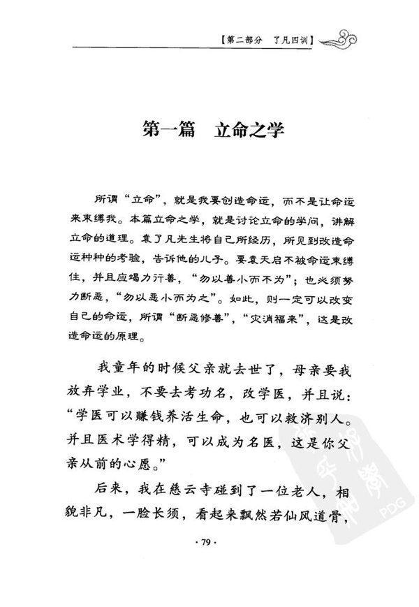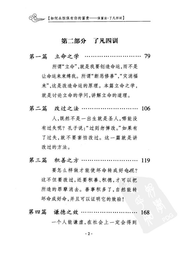 本书第二部分是中国明朝袁了凡先生,结合了自己亲身的经历和毕生学问与修养,为了教育自己的子孙而作的家训,教诫他的儿子袁天启,认识命运的真相,明辨善恶的标准,改过迁善的方法,以及行善、积德、谦虚种种的效验。他在早期验证了命数的准确性,后来进一步通晓了命数的由来,知道人们可以掌握自己的未来,改造自己的命运。就在他的下半生中,又验证了人们完全可以自我“立命”,自求多福的准确性。不过,光是知命、安命是消极的、无益的;而自强不息改造命运的“立命之学”则是积极的和有益的。了凡先生以自己改造命运的经验来“现身说法”;读了可以使人心目豁开,信心勇气倍增,亟欲效法了凡先生,来改造自己的命运。