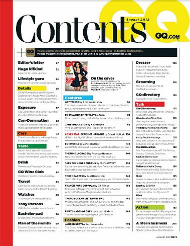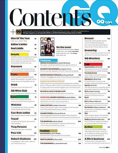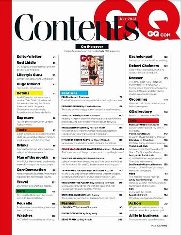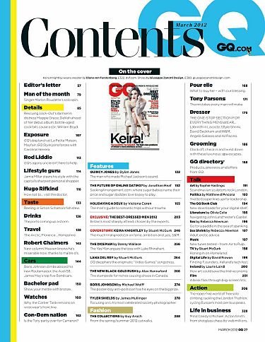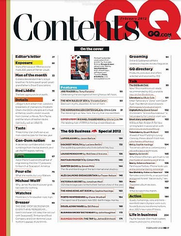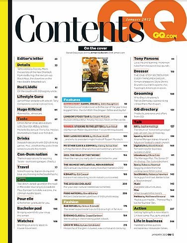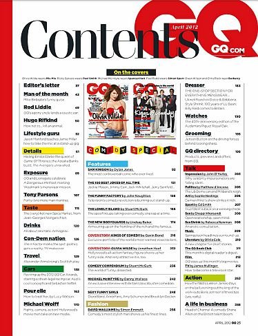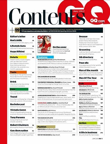 在美国,有一本杂志叫“Gentlemen’S Quarterly”或“GQ”。这本杂志隶属于世界上最大的出版集团康泰纳仕(Conde NastGroup),是一本以描男士穿衣打扮的书。然而"GQ”这个词,今天已经成为日常生活中的语汇了。它代表穿着打扮考究,有品位的一类男人。男士可能会受到如此恭维:“今天你看起来很‘GQ’嘛!”意思就是这个男士穿着适度、入时考究。GQ 是关于时尚、风格、时事及男人事物的杂志。每期呈现世界知名设计师的最新时尚、精彩的小说、 最新的趋势,报导顶尖运动员、刊出最炙手可热的女明星照片,介绍美食和最热门的旅游地点,以及最好的健康、 健美塑身和性的建议。