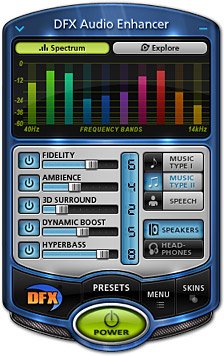 DFX 是一个媒体播放器专用的音效 Plug-In 外挂软件。DFX 有对 MP3 声音文件纠错、和声复原,立体声增强,3D 环绕,重低音增强等功效。安装它之后便可具有 3D 环绕音场效果。安装之后只要设定好便可让播放器播放的 MP3 或 WMA 时的声音具有 3D 环绕音场效果。
