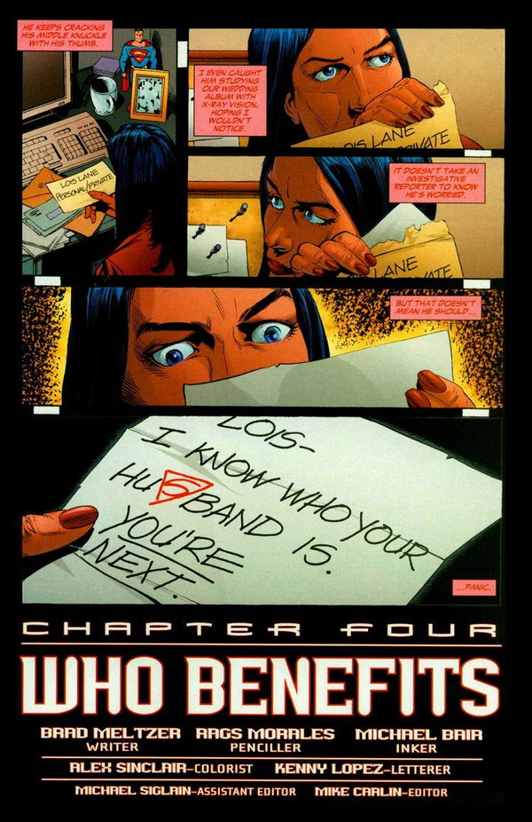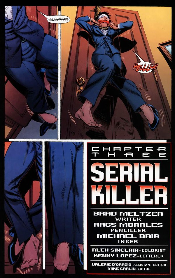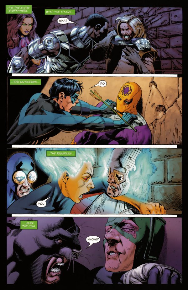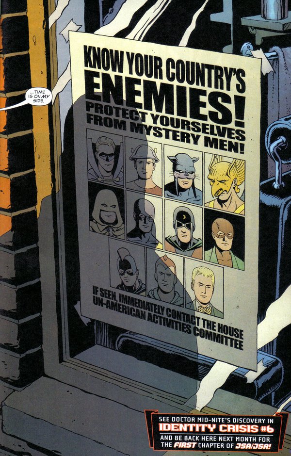 当他们找到Doctor Light,却发现不是他所为.然后Captain Atom的前妻Jean Loring亦被人袭击,幸好Captain Atom及时赶到把她救回,两人更因此再续前缘.然后Superman的妻子Lois Lane接到恐吓信, Robin(Tim Drake)的父亲收到一支枪和字条,要他保护自己,所以他与前来刺杀他的Captain Boomerang同归于尽.新Flash(Wally West)向Green Arrow继续追问当年的事,原来当他们向Doctor Light洗脑时,Batman突然回来看见这事,他们在无计可施下,把Batman制住并把他亦洗去那时的记忆.