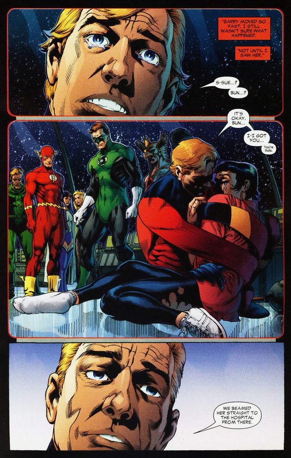 Doctor Mid-Nite查出Sue的真正死因是脑血管闭塞所致,而在那条血管内发现脚印,显然是人为.同一时间,Captain Atom从前妻Jean口中知道是她杀死Sue,原来她一直深爱Atom,想他回到她身边,于是想布局去伤害Sue,造成好像有坏人要刺杀各个英雄的亲人,以使Atom更关心她.不过却意外地害死了Sue,于是她索性毁尸灭迹并再假扮被人袭击,也请杀手去刺杀Robin父亲,并事先送了他一支枪.当Captain Atom知道一切后,把前妻送到精神病院Arkham,自己亦没脸再面对其它英雄,黯然离开.在故事的结尾,失去已有身孕的爱妻的Ralph Dibny显然已经陷入精神失常,他在空房中对着空气交谈,好似Sue依然在世一样.而究竟Superman和Batman知不知道Doctor Light被洗脑的真相,故事内没有清楚说明.不过以Green Arrow的说法,他们两人一直是要听想听的说话,要看想看到的事情,就算他们真的知道了,可能也是因为维系着正义联盟,睁一只眼闭一只眼而已.