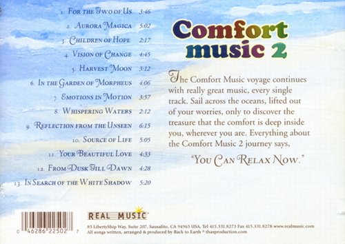这张《Comfort Music 2》(安抚 2) 是 Real Music 隆重推出精选专辑的第二集,13首悠扬乐韵,让听众的思绪尤如漂浮于汪洋大海之中,宁静而舒泰,令你从恐惧及不安中得以释放出来,随之而来的是心灵上得到的平静,绝对是 New Age 音乐的代表作。旋律优美流畅,让你进入一个象宫廷一般华丽的梦中之街;仿佛为安静你度身定作的迷离入烟的气氛,不自觉地枕着浪漫的音乐睡去。新世纪音乐,总披着一层神秘的面纱,将它迷人的风采半遮面似的忽隐忽现 。