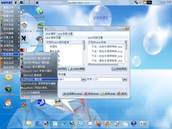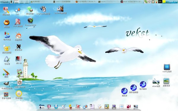 veket是一个容量很小(一般都是200M至350M之间,相对于win7几G的容量称之为很小应该没错),资源要求很低(因为使用的是以省资源闻名的 icewm窗口管理器---相对KDE和GNOME来说速度快多了,对硬件的要求也低很多,所以速度很快,同时也适合用在老旧电脑和上网本上),同时 veket也集成了常用软件,通常安装完veket系统之后即使不另外安装软件也可以完成大部分应用——包括上网浏览,看电影,听音乐,收邮件,网页编辑制作,压缩解压缩,图形图像(专业的GIMP处理),打印,加密文件,办公字处理和电子表格,视频转换,看PDF及还有一个专门的看小说软件及看漫画软件和玩游戏甚至还有集成小型的编译环境等等————就是参与维护和测试veket日常所需要用到的软件都全部集成进veket系统里边去了,所以,安装完的 veket系统所集成的软件已足够满足大部分网友的日常应用需求。