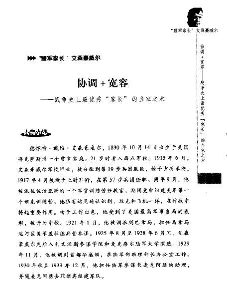 : 1 “盟军家长”艾森豪威尔 协调+宽容 战争史上最优秀“家长”的当家之术 2 “铁血将军”巴顿 信任+勋章 激励下属的最佳法则 3 “近卫军典范”崔可夫 沟通+以身作则 在言语和行动中教化下属 4 “不列颠英雄”道丁 授权+分权 现代管理之领导方式和工作状态的改变 5 “航母战术鼻祖”坎宁安 创新+魄力 成功管理的最大秘诀 6 “英伦军魂”蒙哥马利 知人善用+重视“人” 决定组织良性发展的载体 7 “丛林之狐”孙立人 尊重+关心 四两拨千斤的柔性领导艺术 8 “胜利的象征”朱可夫 纪律+责任 企业迈向成功的双保险 附录: 1 “沙漠之狐”隆美尔 抢占先机 拔得头筹的关键所在 2 “德国的战略家”曼师坦因 决策 长远发展的神经中枢 3 “闪击英雄”古德里安 品牌价值 企业的无形资产